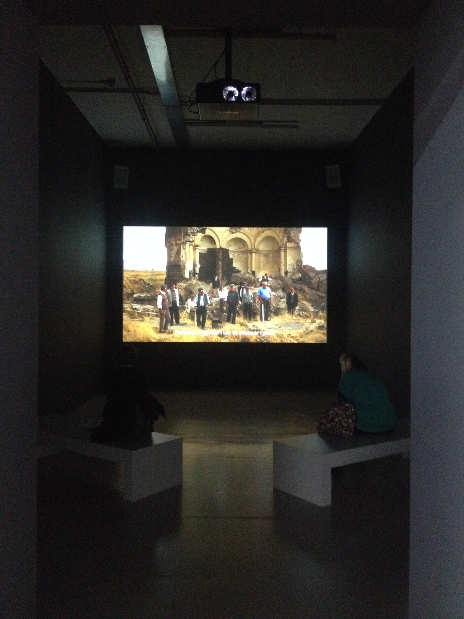 Another work that haunts me is the short film, ‘Blessed are you who come’ by Fatma Bucak. It was both beautiful and intriguing. Subtitled a ‘Conversation on the Turkish Armenian border 2012’, visually it drew me in. The colours are rich, the rugged landscape framing the ancient ruined architecture, maybe from the Ottoman empire (my knowledge of this history is sketchy) provided a filmic stage for the ‘performers’. A group of about 12 or 15 old men (apart from one child that was probably a great grandson), probably 70+ years old, mostly having walking sticks, stand as a group as if posed for a photo, looking forward at the camera, which is static. The subtitles reveal that they have been asked to behave like this “by the Italian”. The narrative is revealed by the comments the men make about why they are there, what brought them there, and snarky little cultural digs, all with humour but clearly very loaded. Whilst these men are not consciously performing, a barefoot woman dressed in a black is – she has a dramatic presence as she moves between them, they mutter about her when she passes, but do not follow her with their eyes, they do their best to keep looking forward at the camera. One or two get a bit irritated, clearly baffled as to why they have been asked to stand there. I empathise. And like them, I am curious enough to stay and watch this film play out. I wonder why, what historical references do I not know about? Are these men veterans of a battle between Turkey and Armenia? The woman shares bread them, but it is Ramadan, the men don’t eat it. So we know they are Muslims. And of course there is the biblical breaking of bread. And maybe she is Muslim too – she prostrates herself, but doesn’t wear a veil, though her hair hides her face. She is timeless in appearance. This work was powerful in many ways and even as I write this, I realise I need to know more. Or maybe I don’t. I watched it three times, it held my attention and I felt both inquisitive about it and charmed by its visual presence.