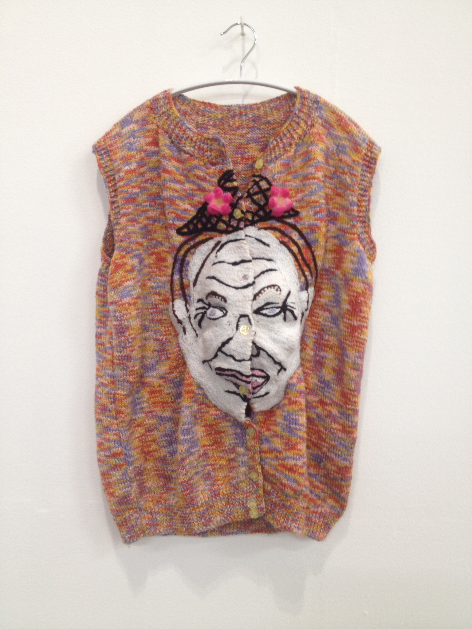 The works in the object group that grabbed my attention the most are definitely the knitted portraits on the jumpers by Hardeep Pandhal. The strange, knitted protrusions that were literally attached to the jumpers, neither 2D or 3D, were head portraits of Tupac Shakur and Bruce Parry. At first sight, my mind immediately drew parallel to something in the news at present – that of the Chinese man who has had a new nose grown on his forehead.