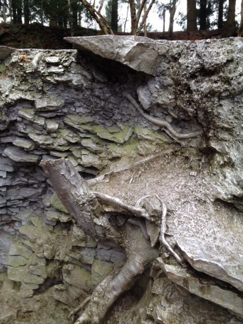 - Annie Cattrell’s work Echo. A cast of an ancient geological strata in a forest. The casting material separated by a plastic membrane, like a screen, one side virtual (the mould being made) the other actual (the rocks).