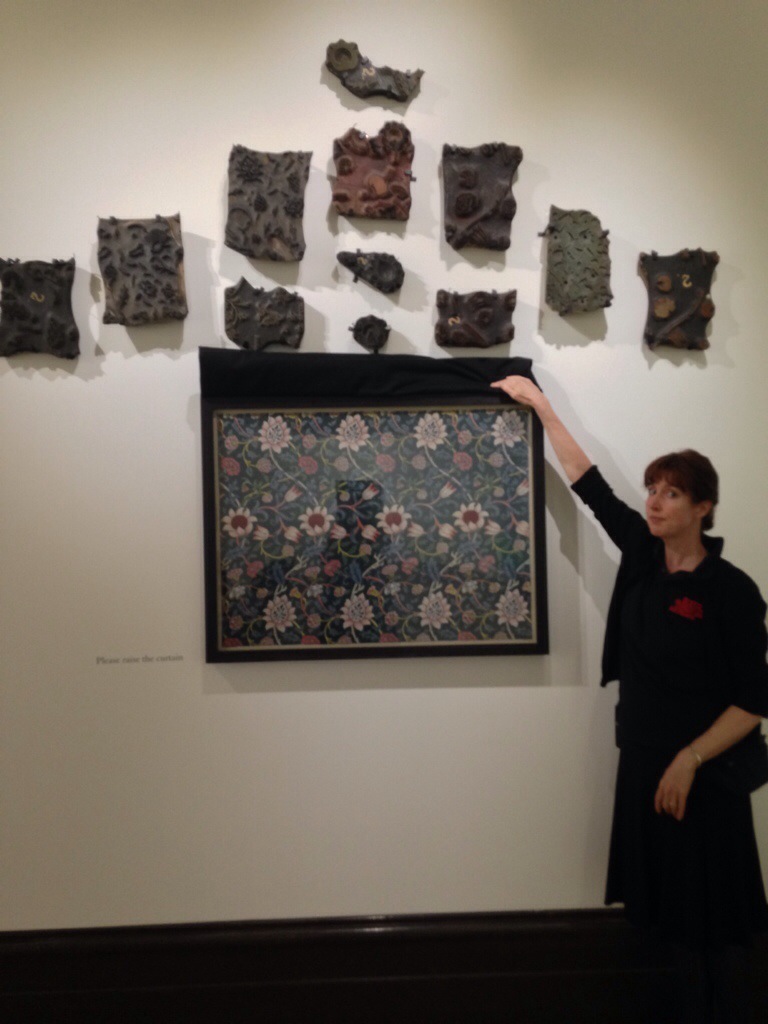 Putting aside the political references in Deller’s work and why a William Morris woodcut is relevant to the huge wallpainting, ‘We Sit Starving Amidst Our Gold’, painted by Stuart Sam Hughes, for Jeremy Deller’s ‘English Magic’, I share below 3 photos of one of the works shown. Deller doesn’t just exhibit the finished woodblock print in the gallery – he also presents 12 of the 33 blocks needed for his Evenlode textile design. And the way the finished work is presented, behind a black velvet cloth that needs lifting to view the work, reminded me of that magical moment of unpeeling blankets of a press and lifting the paper off the plate or block.