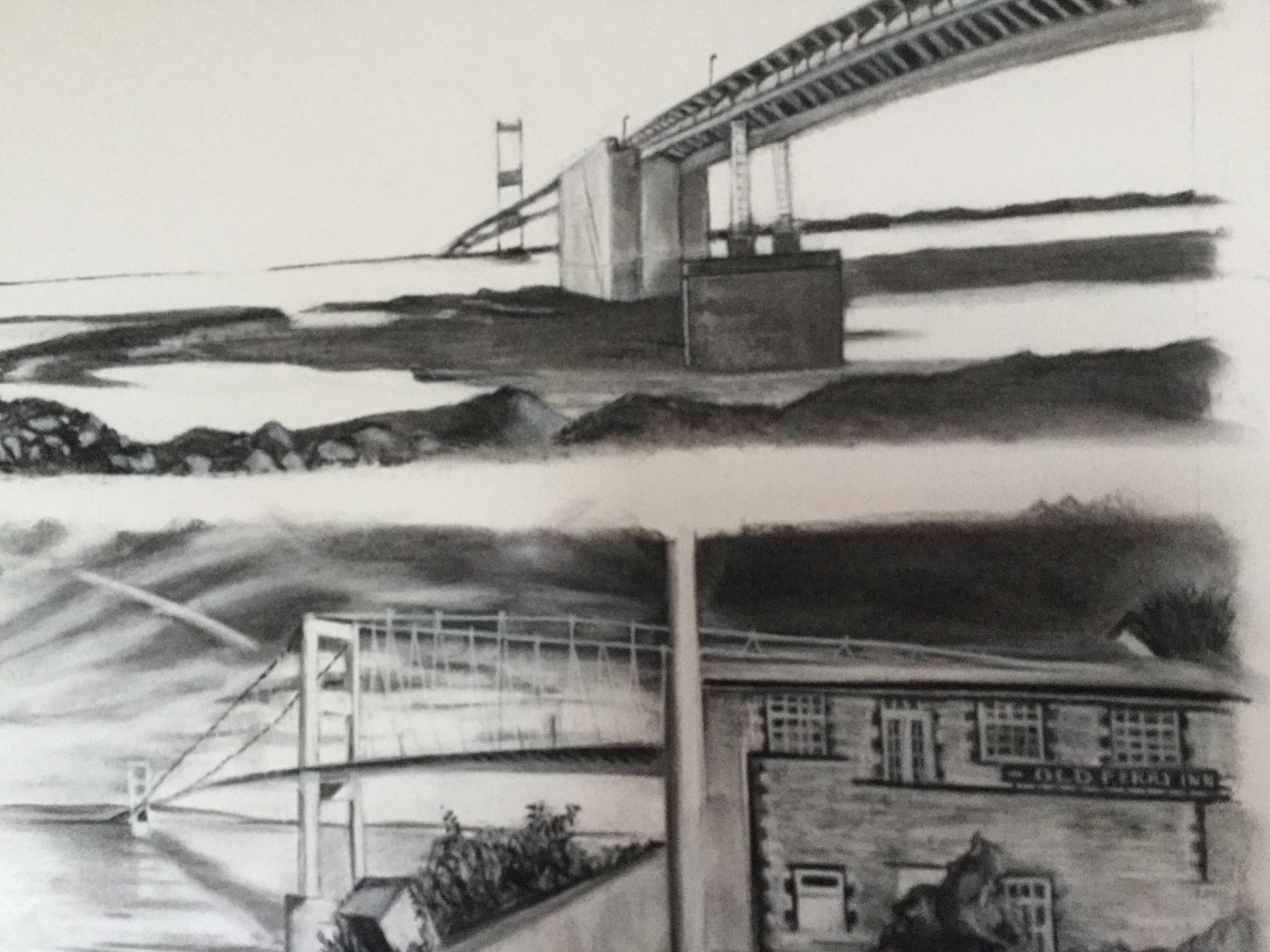 I’ll bring with me the original charcoal panoramic drawings for you to see. You are invited to bring with you any stories you’d like to share about the Old Severn Bridge. As the project is about both sides, I plan to do another meetup on the other side too.