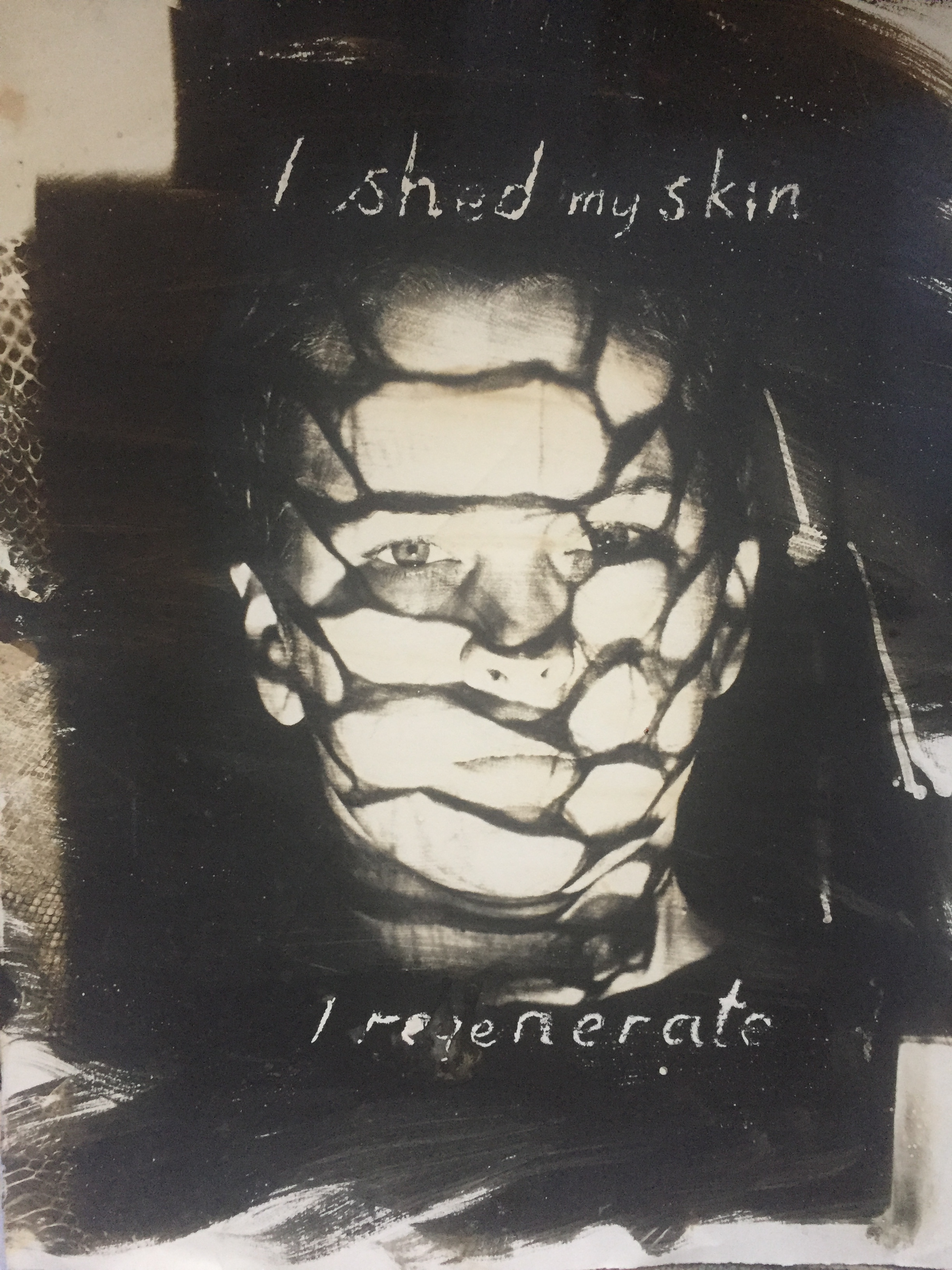 A1 image on watercolour paper, made in dark room, photographic gel brushed onto paper. The image is one of many I made by making glass projector slides with shed snake skins from Bristol Zoo, projected onto my face and body. It was the time of Dolly the sheep – wondering whether we could, in the…