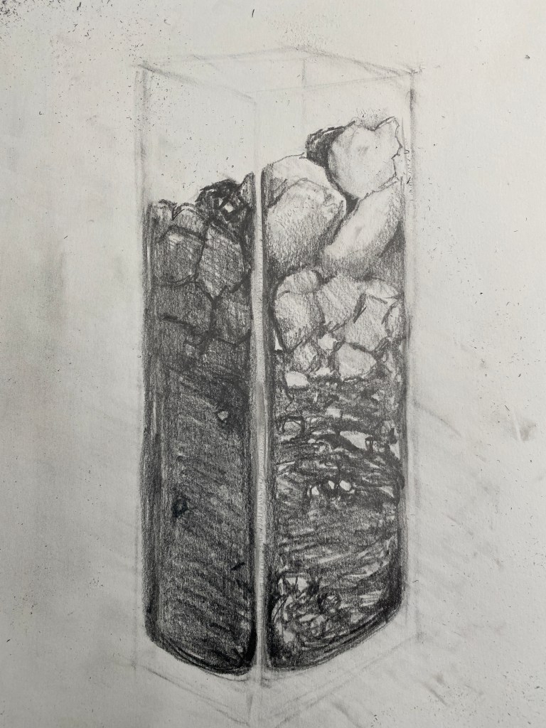 It was only when I was looking intensely at it for twenty minutes that I noticed little bubbles were forming in the red liquid. Some organic matter was releasing gas from the soil into the water, compacted by the weight of the dry material above. Those little bubbles reminded me of the first exercise we did, of blowing bubbles onto paper. And of the time that a geologist explained to me that the smooth circular bumps and hollows in quarries were caused by air trapped during the rocks’ formation. When it came to drawing the vase and its earthy contents from memory, without looking, I wondered if I could include the bubbles, but using a chunky graphite pencil at a smallish scale defeated me.