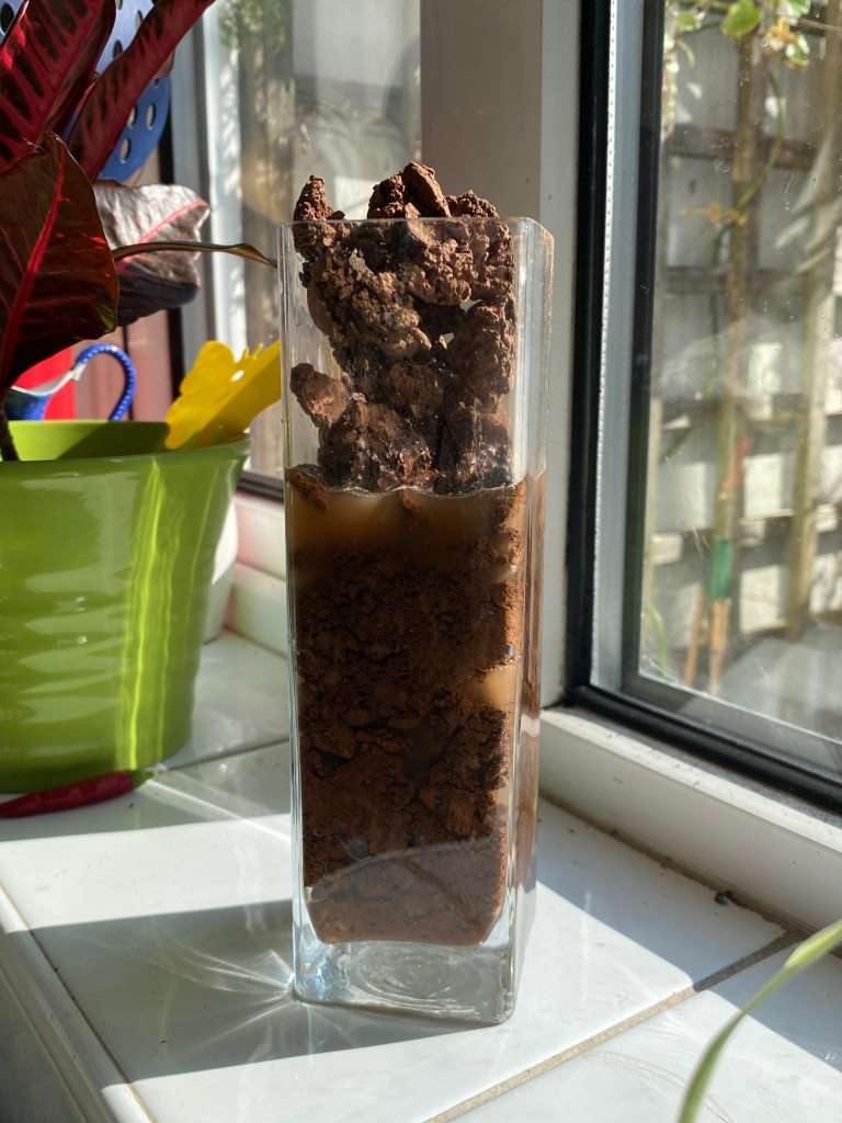 So, going back to the soil for the drawing exercise. During the lunch break, I piled it into square glass vase then half filled it with water. It was mesmerising watching the material dissolve into the water, slowly sinking, settling. A small amount remained dry, like mountains, or icebergs, paler than the wet earth below, creating air pockets. I made a tiny video.