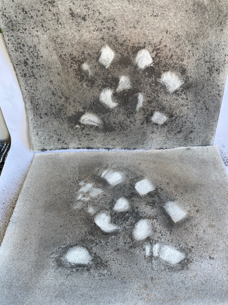 I’ve been reworking the graphite shadow-drawings of stones, by polishing with cloth, erasing and redefining. I placed the first darker image above the 2nd, the solid rocks of the cliff perpendicular to the ground, where fragments fall. I used the first image to inform the process of drawing into the 2nd – giving it more presence – in an attempt to reconstruct the crumbled elements. Stippled pigment activated with a wet brush, to simulate the marks made on the first drawing.