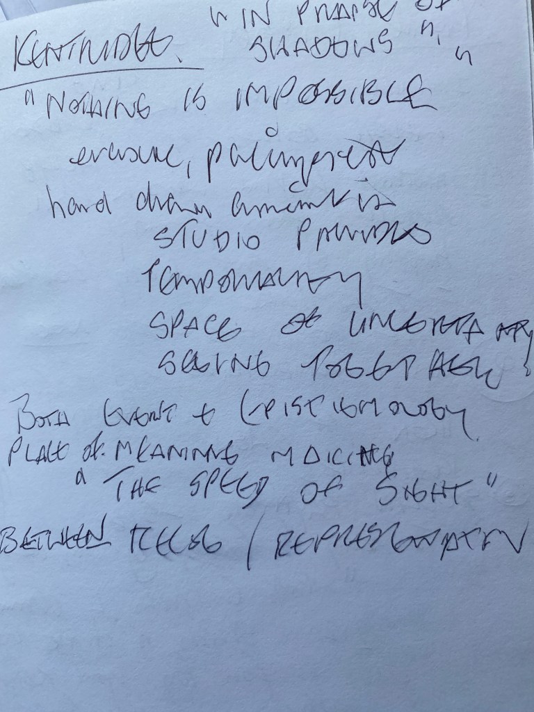 His lecture, In Praise of Shadows, is framed by the thinking behind Plato’s cave – raising thinking around what is real, what is not. How important drawing is. His voice and thinking is so fascinating, this is not the first time I have heard this. I find a pile of old notebooks and flip through them, one opens on the page of the notes I made about the lecture last year. I will probably read more old notes this evening.