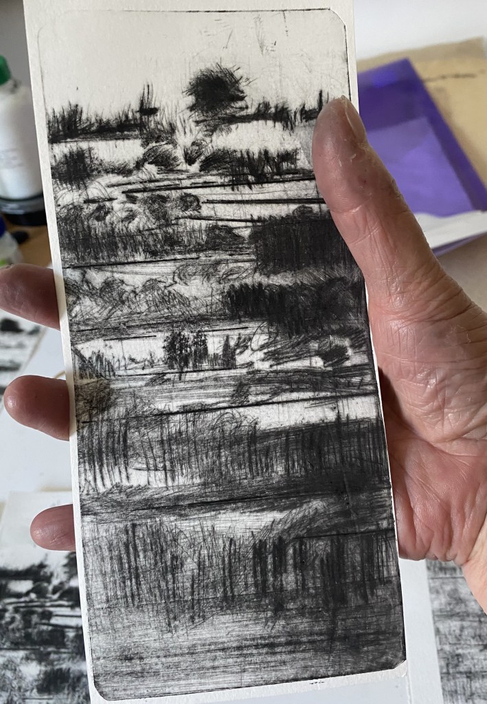 Printmaking: a drypoint that fits in my hand, and a 1 metre vertical panoramic, using paper litho, that doesn’t.